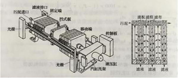 板与框相间排列而成,在滤板的两侧覆有滤布,用压紧装置把板与框压紧,即在板与框之间构成压滤室。在板与框的上端中间相同部位开有小孔,压紧后成为一条通道,加压到0.2~0.4MPa的污泥,由该通道进入压滤室,滤板的表面刻有沟槽,下端钻有供滤液排出的孔道,滤液在压力下,通过滤布、沿沟槽与孔道排出滤机,使污泥脱水。国内外已开发出自动化的板框压滤机。板框压滤机比真空过滤机能承受较高的污泥比阻,这样就可降低调理剂的消耗量,可使用较便宜的药剂(如FeSO4·7H2O)。当污泥比阻为5×1011~8×1012m/kg时,可以不经过预先调理而直接进行过滤。板框压滤机其泥饼产率和泥饼含水率,应根据试验资料或类似运行经验确定。泥饼含水率一般可为75%~80%。[1]