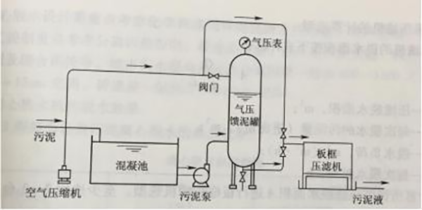 板框压滤机的滤板、滤框和滤布的构造示见图1,其中(a)为滤框,(b)为滤板,(c)为滤布。板框压滤机构造见图2,板框压滤机及附属设备布置方式见图3,除板框压滤机主机外,还有进泥系统、投药系统和压缩空气系统。[1]